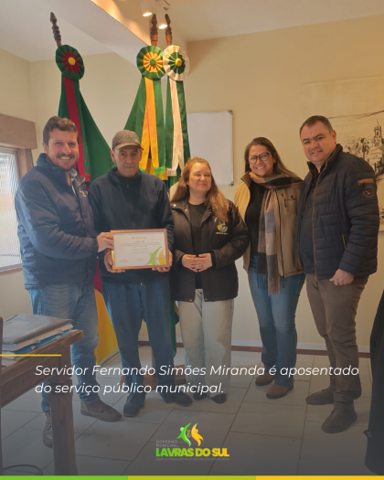 Na manhã desta sexta-feira (11), foi realizada no gabinete do prefeito a formalização da aposentadoria do servidor Fernando Simões Miranda, que atuava como operário na estrutura da Prefeitura de Lavras do Sul.